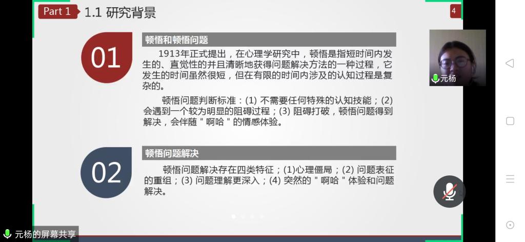 本次开题报告会中,研究生围绕选题意义、研究逻辑、研究方法、实验设计、进程安排等方面进行了详细汇报。研究生选题广泛,涉及眼动样例对多媒体学习的影响、自动观点采择的加工机制、敬畏对自然冒险倾向的影响、顿悟问题解决等课题。开题报告会现场气氛热烈,学术氛围浓厚。与会导师从多个方面对研究生的选题进行考量,对每位研究生的开题情况逐一点评,针对存在的问题提出了宝贵的修改意见和建议,并就论文下一步的开展实施提出了建设性意见。经过各位硕士生导师的认真修改与讨论,每名研究生明确了下一步的研究任务,为论文的完成奠定了坚实的基础。本次论文开题报告会取得了圆满成功。